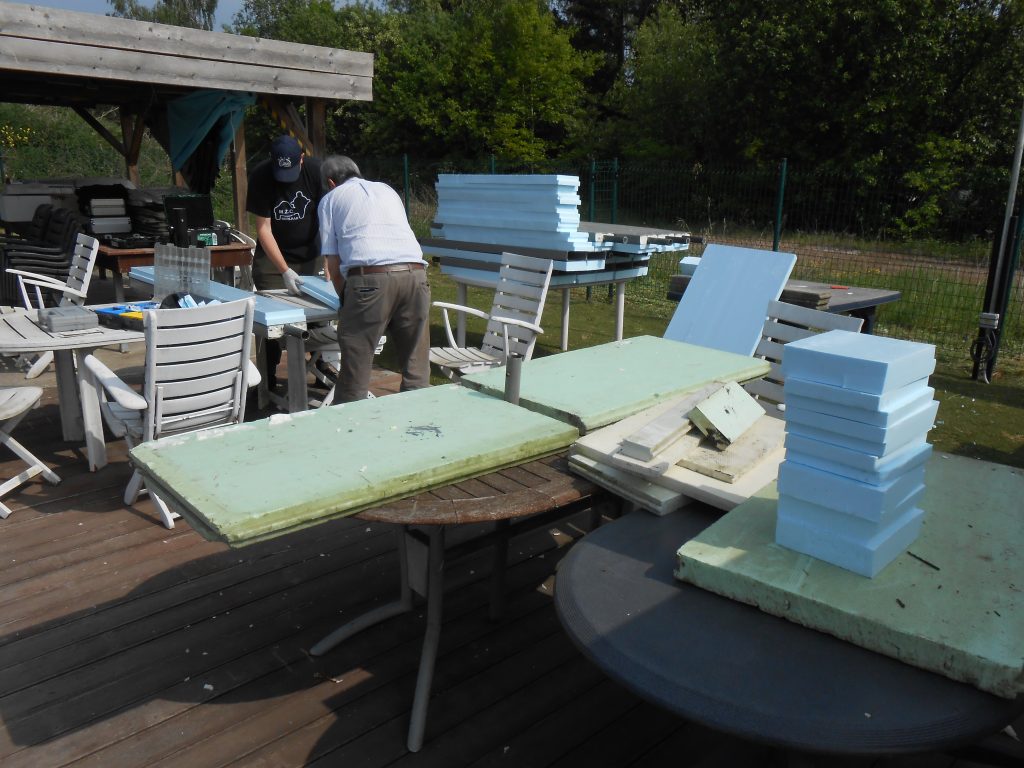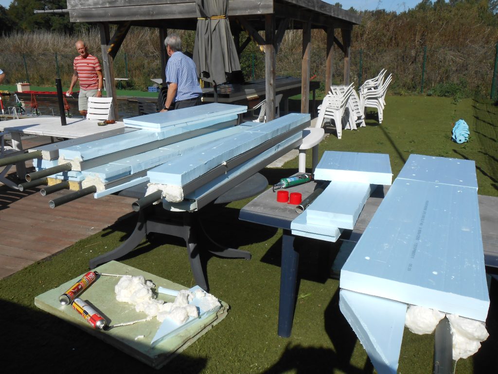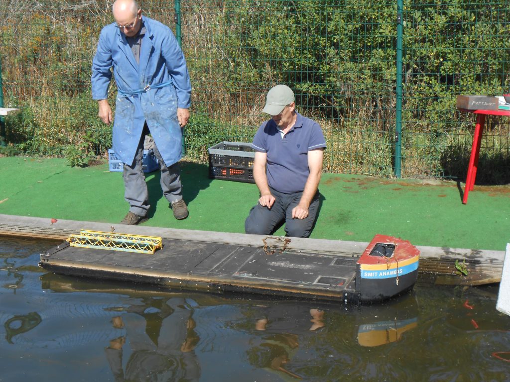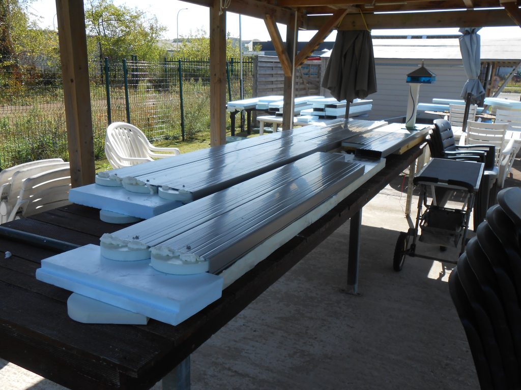 De stukken van de nieuwe haven worden één voor één klaar gemaakt Stilletjesaan geraakt alles op maat gesneden en kunnen we monteren hier al gemonteerd en geschuimd , ook de aluminium koppelstukken zijn geplaatst .Als er gewerkt word komen de echte werkschepen er aan te pas Even overleggen hoe we dat nu weer moeten uitvoeren , misschien nog een laagje verf ?? Of laten we dat over aan anderen ??